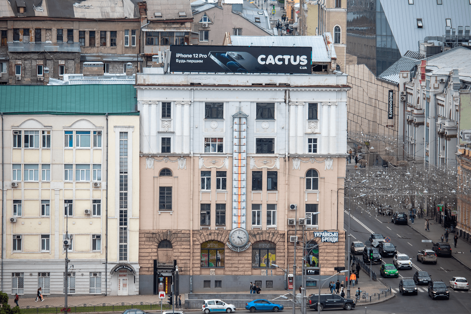 Некоторое время на градуснике красовался логотип компании «Киевстар». Затем его сняли.