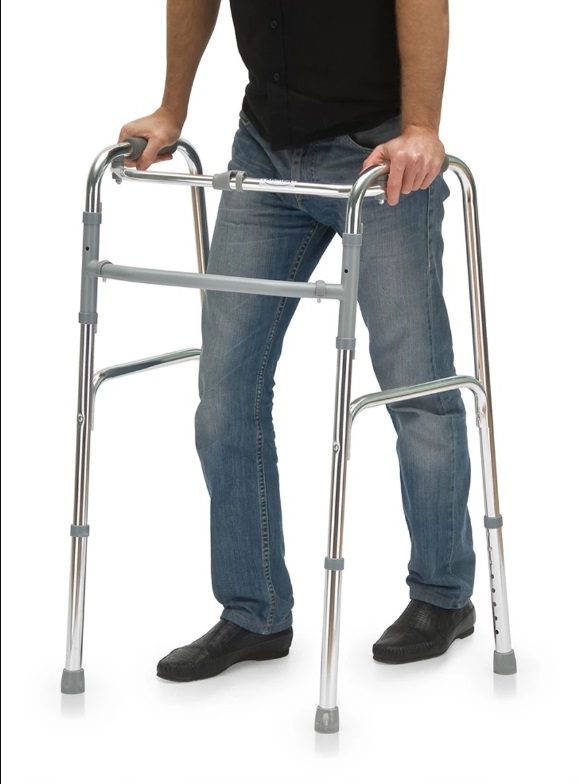 - Шагающие ходунки, которые состоят из двух жестких боковых сторон, соединенных шарнирной перекладиной. При передвижении человек попеременно переставляет левую и правую стороны – переставляя правую боковую часть, делает шаг правой ногой, переставляя левую боковую сторону, делает шаг левой ногой. Эти ходунки очень часто используют именно для пожилых пациентов, так как они достаточно устойчивые, но при этом требуют определенных усилий для движения, не допуская дальнейшего ослабления собственных мышц;