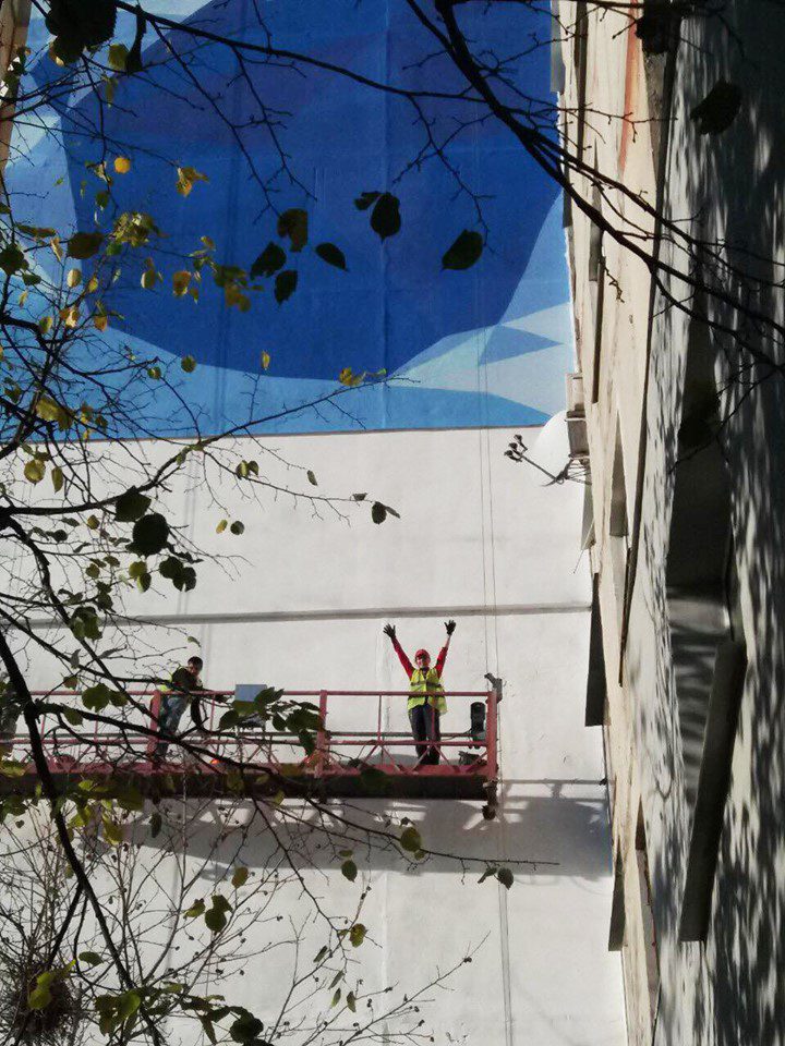 Об этой идее Анастасия Худякова рассказала в интервью изданию KHARKIV Today. Также она поведала и о том, как создавался этот сложный арт проект. По ее словам, изначальный цельный рисунок был разделен на три части и преобразован в изображение, состоящее из геометрических фигур. На каждом треугольнике, а именно эту фигуру решили использовать художники, был написан номер, соответствовавший определённому цвету, что позволило правильно покрасить стены, чтобы картинка совпала. Работали художники в очень сложных условиях, на высоте 48 метров. Рисование происходило в люльке для высотных работ со страховкой.