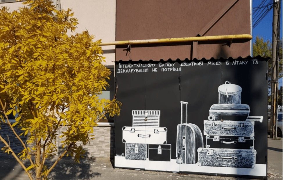 Ще одна знаменита робота Зіньківського, розташована на перехресті Лопанського провулку та Лопанської набережної. Влучно обігрується порівняння духовного та фізичного. І якщо особисті речі потребують додаткового місця будь-де, то інтелектуальні здобутки за плечима не носити, як каже народна мудрість. Час появи картини ― 2018 рік.
