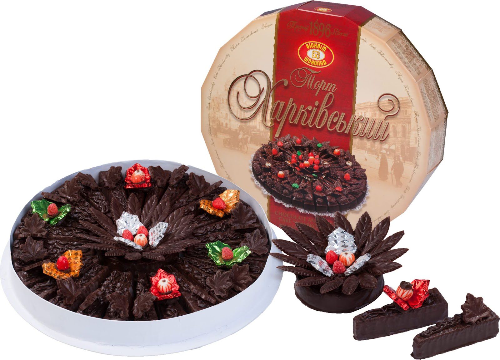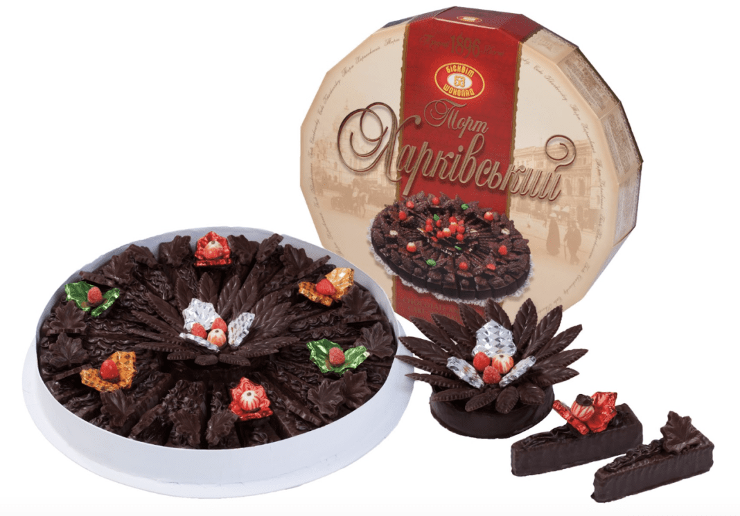 “Харківський” – це порційний шоколадно-вафельний торт, покритий шоколадною глазур’ю. Виріб складається з 11 вафельних коржів. Як прошарок використовується горіхове праліне та тертий фундук. Фірмові елементи декору – це фігурки з шоколаду та різнокольорові фрукти з шоколадної помадки.
